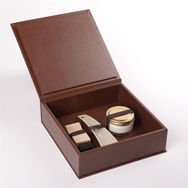Кутия от изкуствена кожа. Размер: mm.195x195. Съдържание: Крем за полиране в стъклен буркан, обувалка ABS, Четка SC38 Черна. Кутията и цялото й съдържание може да бъде персонализирана с марката на клиента.